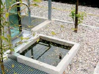 Ein Straßenraum mit hoher Betonwand, mit Rieselbankett und filigranen Buxbaumstrukturen.