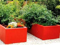 Ein Zwischenraum als Bauerngarten mit tomatenroten Hochbeeten, Laubengangelementen und Wasserbecken